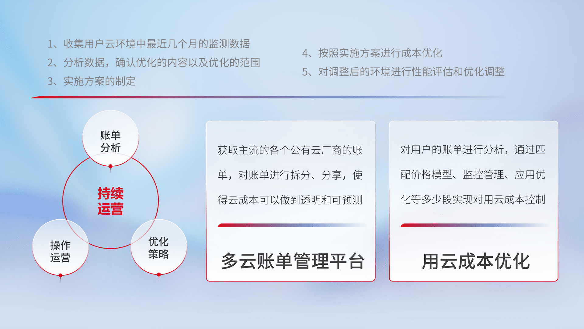通过多云纳管,,以统一的资源数据模型把客户的云资源进行抽象和封装,,,,进而实现对多云资源的统一操作,,,保障云资源管理的可靠性、、、、稳定性与可用性。。。。量身定制化运维内容,,,,配置、、、、开发运维、、、、补丁管理、、备份、、、监控、、、、认证和访问管理、、、、审计和日常巡检等,,保障在用云过程中的可靠度,,,,稳定度以及高可用率。。。。
