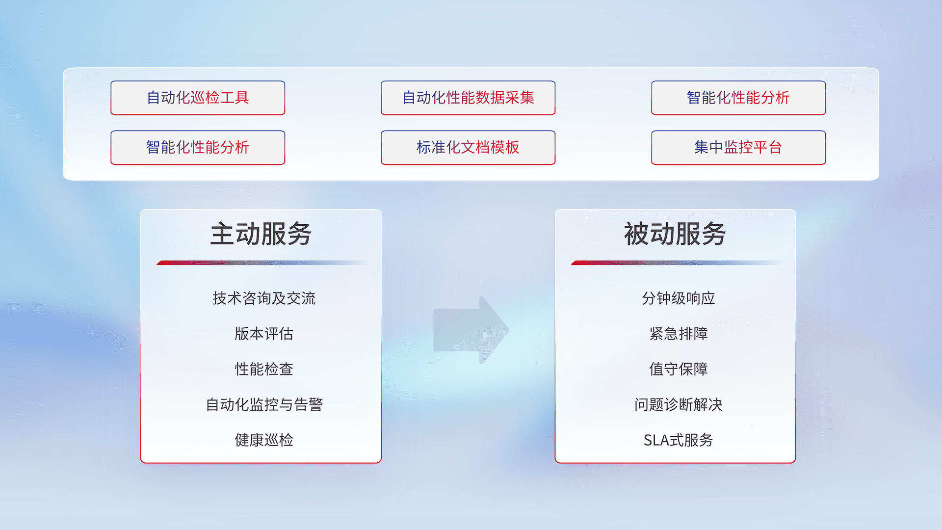 智能化工具和标准化文档,,,保障服务质量,,,,提供主动服务(包含技术咨询、、、、版本评估、、性能检查、、自动化监控与告警、、健康巡检)和被动服务包含(分钟级响应、、、、紧急排障、、、、值守保障、、、、问题诊断解决、、、、SLA服务)。。。。